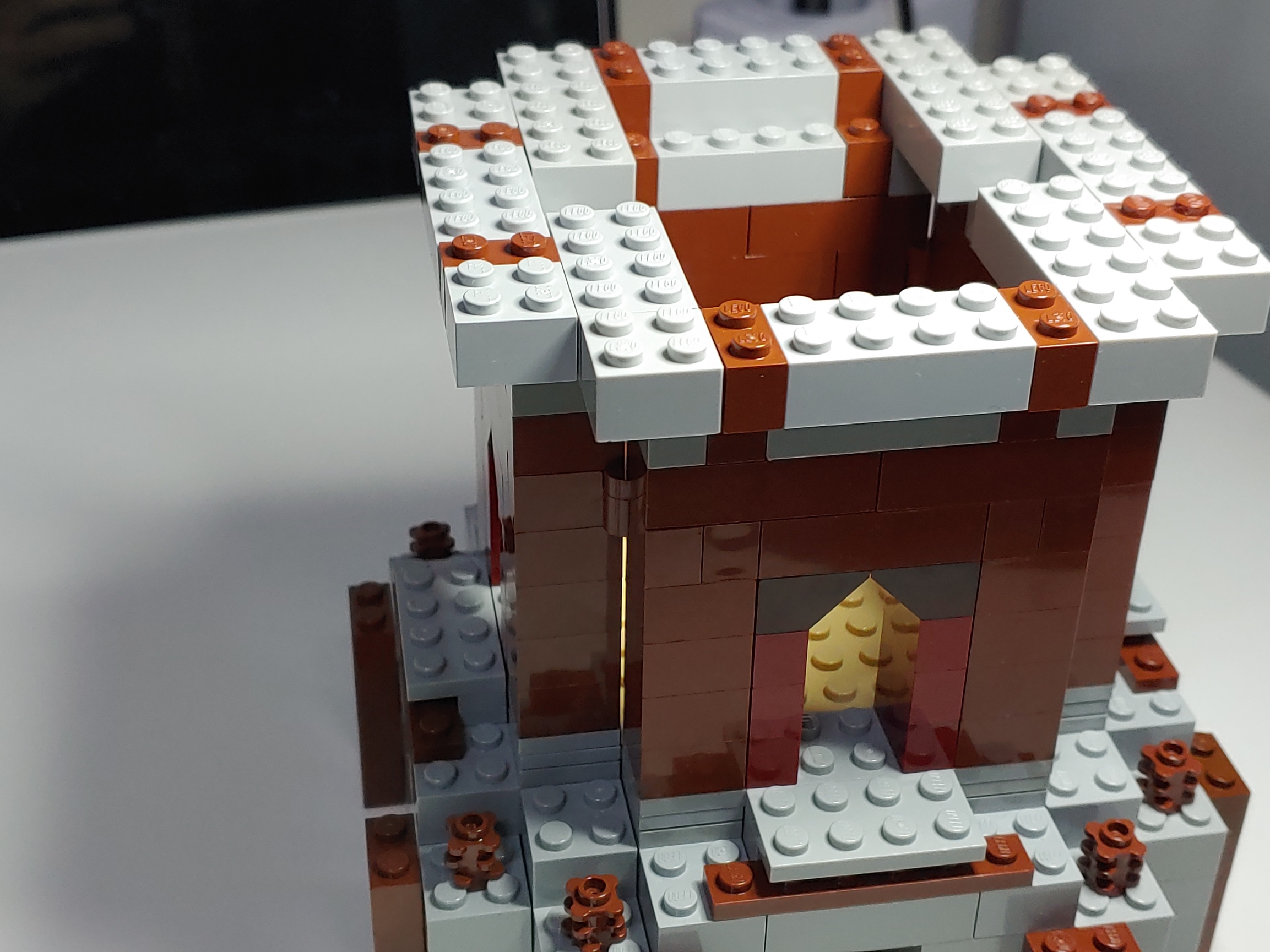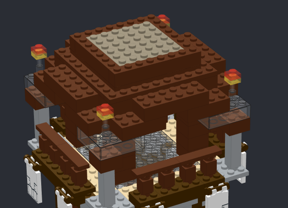아래 좌측에서 난간을 돌출하도록 만들어주고(이대로는 매우 불안정합니다.) 4x8, 4x4 플레이트로 단단하게 고정해서 2층 천장 구조를 완성합니다. 노란 타일은 3층 바닥을 지지하기 위한 목적입니다.